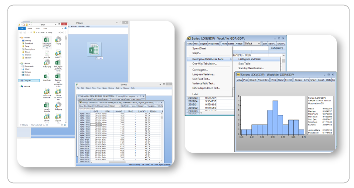 El conjunto de elementos pensados en la usabilidad, potencia y facilidad de uso hacen de EViews el paquete ideal para el trabajo con datos asociados a series de tiempo, corte transversales o datos longitudinales, todo apoyado en una innovadora interfaz gráfica orientada a objetos y un motor de análisis sofisticado,