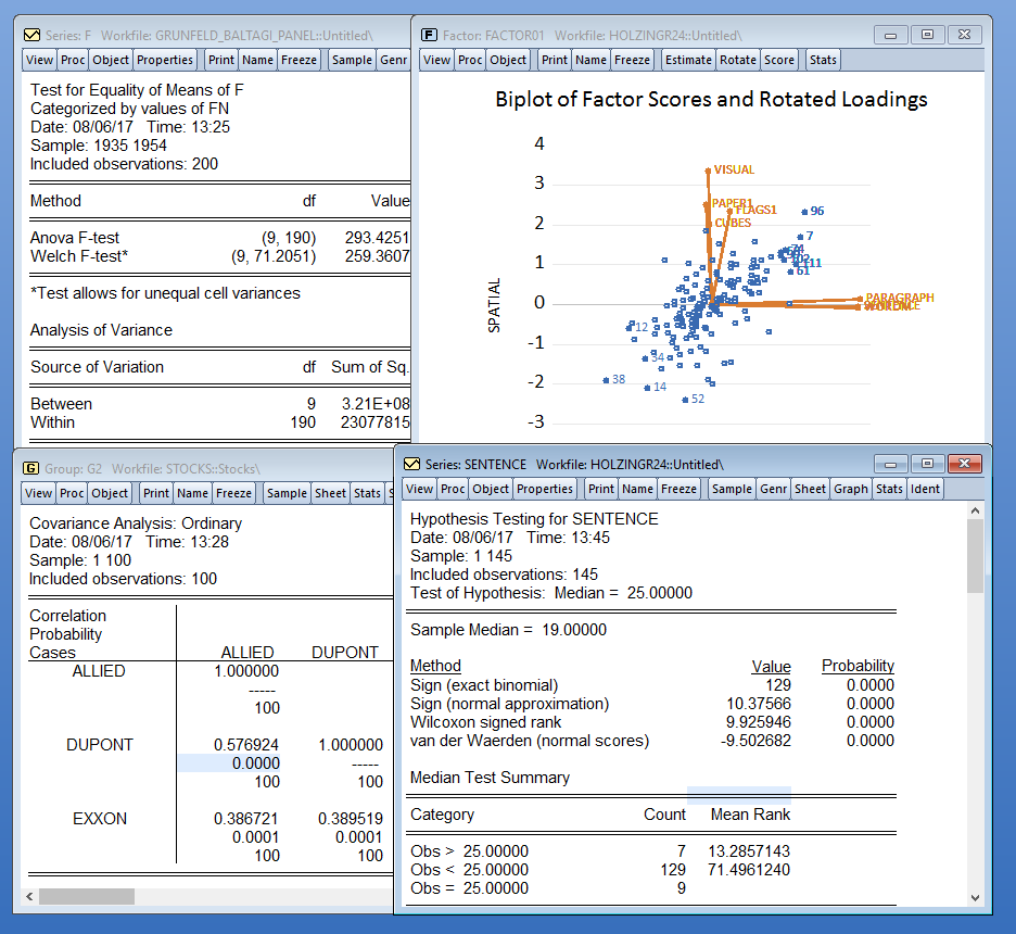 EViews proporciona funciones de autocorrelación y autocorrelación parcial, estadísticas Q y funciones de correlación cruzada, así como pruebas de raíz unitaria (ADF, Phillips-Perron, KPSS, DFGLS, ERS o Ng-Perron para series de tiempo único y Levin-Lin-Chu, Breitung, Im-Pesaran-Shin, Fisher o Hadri para datos de panel, así como pruebas de raíz unitaria de punto de corte y raíz unitaria estacional), pruebas de cointegración (valores críticos de Johansen con MacKinnon-Haug-Michelis y valores p, Pedroni, Kao o Fisher para datos de panel) y pruebas de causalidad e independencia.